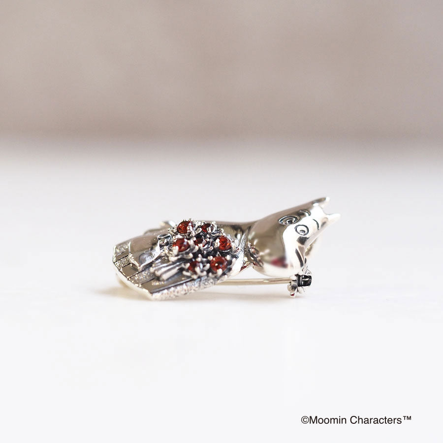 Moomin? Moominpappa? Who gave her this bouquet? This brooch pendant features Moominmamma, holding a large bouquet with a cute, surprised expression. The bouquet she is holding is set with garnet.