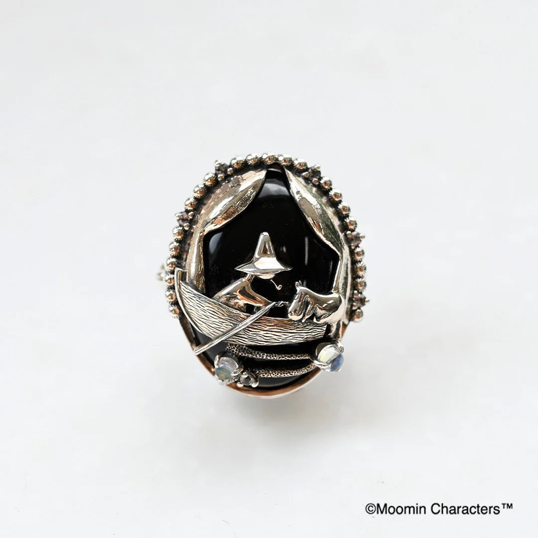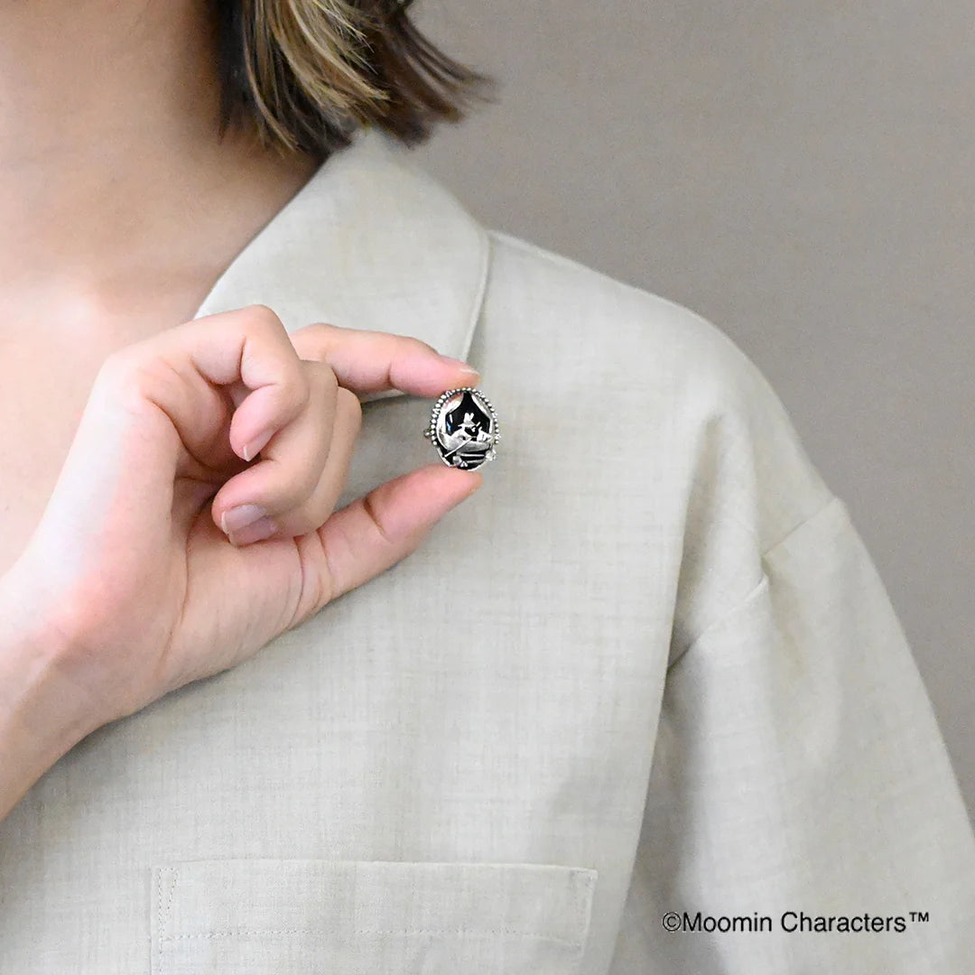 chic and cute brooch pendant and ring features Moomin climbing onto Snufkin's boat, which comes to his rescue.