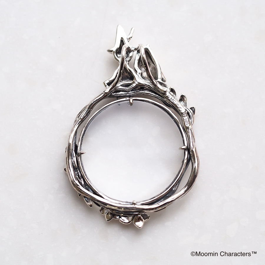 This adorable magnifying glass pendant features Snufkin and Moomin, who love traveling freely, gazing at the stream together on a bridge. The frame, crafted like a twig, is inspired by the beautiful Nordic forests and combines with a natural texture.