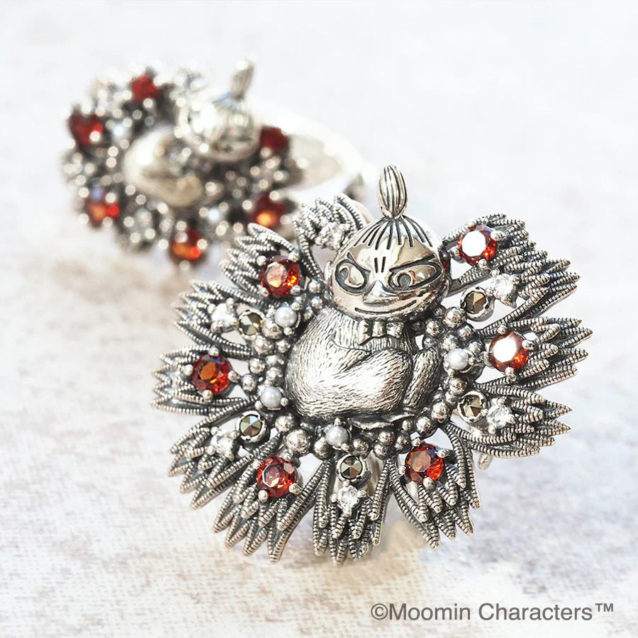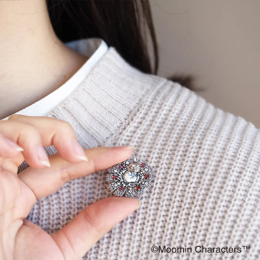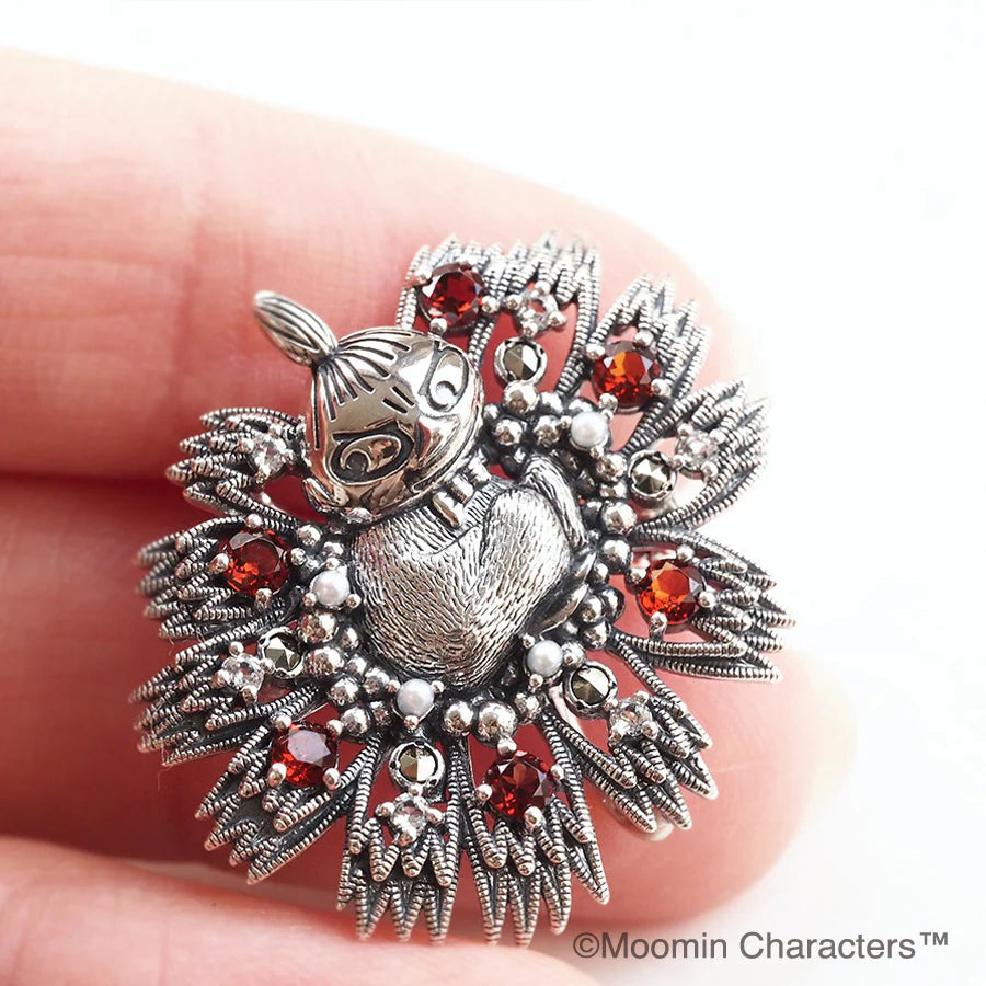 This brooch pendant features Little My perched on a flower from the Moomin comics, "Moominvalley Becomes a Jungle." Her determined expression as she waits for the storm to arrive is accentuated by flowers made from Little My's colors of red garnet, white topaz, and seed pearls. It would also look lovely as a stole clasp or necklace.
