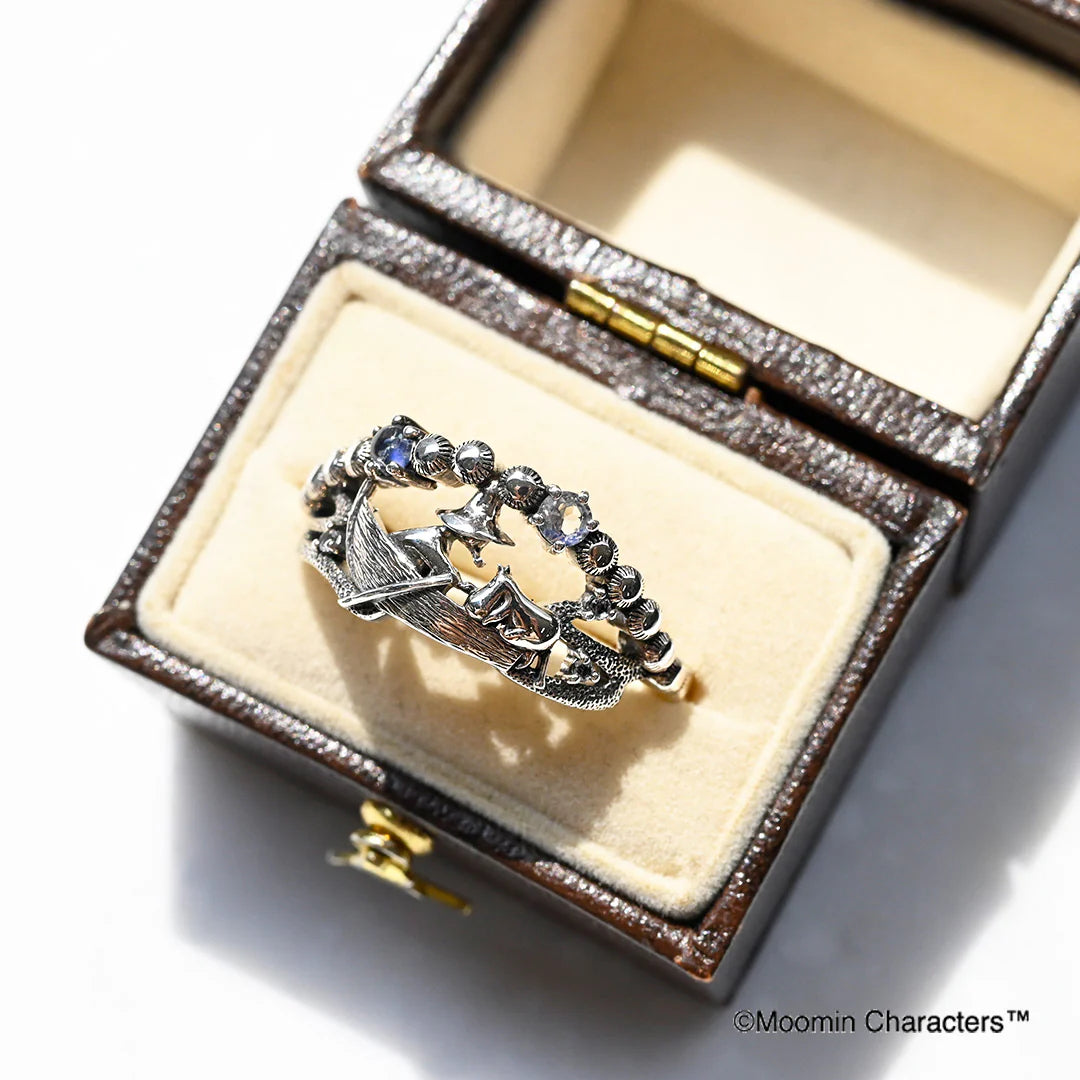 chic and cute brooch pendant and ring features Moomin climbing onto Snufkin's boat, which comes to his rescue.